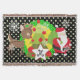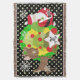 Santa and Reindeer Christmas holiday throw blanket, colourful, fun, cute, and cheery! Features Santa Clause dressed in his red suit and stocking cap with a bag of toys flung on his back, a Christmas tree with red balls, cute brown reindeer, snowflakes, and white polka dots on a background of black, green, and yellow. There's also a star shape banner you can personalize with your monogram initial!