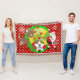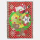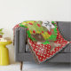 Santa and Reindeer Christmas holiday throw blanket, colourful, fun, cute, and cheery! Features Santa Clause dressed in his red suit and stocking cap with a bag of toys flung on his back, a Christmas tree with red balls, cute brown reindeer, snowflakes, and white polka dots on a background of red, green, and yellow. There's also a star shape banner you can personalize with your monogram initial!