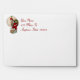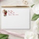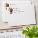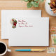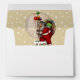 Holiday envelope with an insert of Santa stepping into a very narrow chimney with a huge bag of gifts on a pale gold and snowflake background. The return address is customizable.