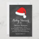 Fancy ribbon script and a bright red Santa hat accent this chalkboard baby shower invitation, making it perfect for the winter, Christmas or holiday time shower.