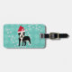 This fun, cute cartoon style black and white Boston Terrier dog stands happily while wearing a Santa hat. Design by Diane Blackman