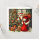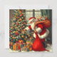 This image shows Santa laying a gift under a decorated Christmas tree. The fir tree is decorated with balls, garlands and a star. There are other gifts wrapped under the tree. Santa carries a large red bag on his shoulder, filled with more gifts. In the background, you can see a window with a snowy landscape. The image exudes a festive and joyful atmosphere.