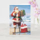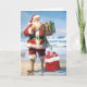 Une scène de plage tropicale vibrante avec un ciel bleu clair au-dessus. Le sable doré s'étend à perte de vue et se fond dans les eaux cristallines de l'océan. Au premier plan, le Père Noël est représenté dans sa tenue traditionnelle. Père Noël est pieds nus et a roulé son pantalon pour marcher dans les eaux peu profondes du rivage. Il tient un grand sac de burlap rempli de jouets colorés qui se couchent sur son épaule. Père Noël joues roses et expression joyeuse indiquent qu'il profite pleinement de son temps à la plage. Le design capte l'esprit fantaisiste et ludique de la saison des Fêtes, avec une touche unique sur l'image traditionnelle du Père Noël, en faisant une carte de voeux mémorable et chaleureuse pour toute personne qui la reçoit.