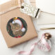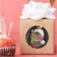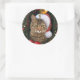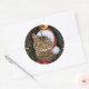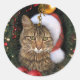 Close up of a tabby cat wearing a Santa hat, framed by a christmas wreath and ornaments.
