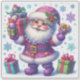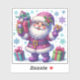 A jolly Santa Claus dressed in a cheerful violet outfit joyfully holds colourful wrapped presents. Surrounded by festive snowflakes and holiday decorations, he embodies the spirit of Christmas, spreading warmth and cheer during the holiday season.