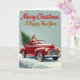 This card shows a festive holiday scene, featuring a jolly Santa Claus driving a classic cherry-red car through the snow. Santa looks happy in his red suit and hat, with his white beard flowing as he drives the vintage convertible. In the back seat, there's a beautiful green Christmas tree ready to be decorated, adding a natural touch to the scene. The car shines with its chrome bumpers and white tires, glowing headlights cutting through the snowy night. At the top of the image, the words "Merry Christmas & Happy New Year" are written in a graceful script, matching the warm colors of the season. The design is balanced and inviting, with Santa's gaze drawing you in and the car angled to show movement. This card has a sophisticated, nostalgic feel, with clean illustrations against a cool background, making the reds and greens stand out. With its cozy holiday vibe, this card is perfect for spreading some festive cheer 🎅🏼🎄🎁.
