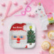 Merry Christmas is written in festive white typography across Santa's red white furry hat. Jolly Santa Claus with rosy cheeks, blue eyes, white beard, big red nose and red whit furry hat. Decorated old-fashioned Christmas tree in the background with gingerbread man, candy canes, ornaments, and yellow star on top. Original Artwork © 2013, 2015 TamiraZDesigns.