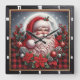 This dramatic square wall clock features a close-up portrait of Santa Claus set against a brilliant full moon and starry night sky. Santa, with his iconic red hat and flowing white beard, is framed by an elaborate holiday wreath. The wreath includes red poinsettias, holly berries, white and silver pinecones, and red glass ornaments. The base of the portrait is anchored by a band of rustic red and black buffalo plaid. The entire design is contained within a wide, dark outer wood-look frame, which is simulated using high-detail artwork and is not real wood.
