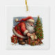 Cute Santa with a Christmas tree and gifts on a ceramic Christmas ornament. Text on back can be changed. Watercolor illustration with AI assisted graphic purchased with commercial use. Artwork: RedHeronLighthouse