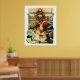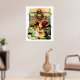 A beautiful vintage Christmas poster featuring Santa Claus quietly visiting two sleeping children in front of a fireplace.