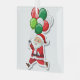 Illustration of a cartoon Santa Claus running with a bunch of balloons, the balloons are red, green and white, Santa is white, around 70 years old, with white hair and beard, wearing a red suit with white fur trim and a black belt, the illustration is on a white square ornament with a white ribbon at the top.