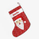Destei's cartoon illustration of a happy Santa Claus head on a red background colour with some white dots. There is also a personalizable text area for a name on the top of the stocking.