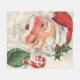 Beautiful vintage Christmas card with smiling Santa Claus with red rosy cheeks, saying HO HO HO. He is holding a big red and white candy cane in his green gloved hand.
