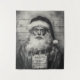 A hyper-realistic, black-and-white depiction of Santa Claus in a mugshot scenario. The detailed image shows Santa in his traditional attire, but with a worn, distressed look, complete with a sign hanging around his neck. Behind him is a vintage measurement chart, adding to the gritty, dramatic tone. This unconventional portrayal gives a mysterious, rebellious twist to the beloved holiday icon.