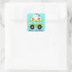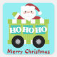 Santa Claus waves from a train car that says HO HO HO on this cute Christmas sticker. Predominant colours in the image are red and white, lime green, and turquoise blue. At the bottom is your custom text in red. The image and text are placed on a lighter blue background. Bright, colourful, and kids will love it!