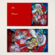 Colourful, whimsical and artistic acrylic painting ,Santa is playing violin in the snowy winter night ,an owl ,floral ornaments,winter plants, holly berries in bright red,green,white,blue,yellow colours.