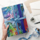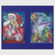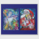 Colourful, whimsical and artistic acrylic painting ,Santa is playing violin in the snowy winter night ,an owl ,floral ornaments,winter plants, holly berries in bright red,green,white,blue,yellow colours. by Bulgan Lumini (c)