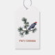 A crow wearing a red and white Santa cap on pine branches on these elegant winter gift tags.