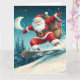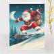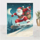 Add excitement to your with a vibrant illustration of Santa Claus delivering presents on a snowboard. Dressed in his classic red suit, Santa glides down a snowy slope with a sack of gifts, surrounded by wintery trees and festive cheer. Modern, adventurous and fun design.