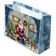 A cute whimsical Christmas gift bag with a woodland creatures theme. A deer and raccoon sit by Santa as he sips hot chocolate by his vintage RV camper.