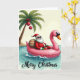 This fun, summery Christmas card features Santa Claus on a tropical vacation. Santa is fully dressed in his traditional red suit, but he is relaxing in the ocean on a huge, bright pink flamingo inflatable float. He's wearing sunglasses and looks completely at ease while floating near a beach with a palm tree decorated with giant red Christmas ornaments. The cheerful greeting "Merry Christmas" is written across the bottom in a cursive font. This card is an ideal choice for sending warm, beach-themed holiday wishes, especially from warmer climates. 🎅🏼