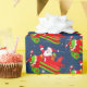 Cute Christmas Santa flying an airplane with a sack full of gifts and the propeller has red and white stripes wrapping paper.