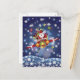 Christmas Santa Claus with Reindeer Flying a Festive Decorated Old Antique Vintage Classic Propellor Airplane Delivering Boxes of Gift Wrapped Presents on a Blue Snowing Night Background Drawing Illustration Postcard