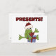 Santa Frog holiday T-shirts, sweatshirts, tote bags, cards, stickers, mugs, magnets, keychains, and other holiday apparel and gifts featuring a frog in a Santa hat, presents, and text that reads "Presents!".