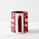A Christmas mug featuring a pattern of Santa outfit elements, like the hat, boots, and fake beard. The mug has a red background. The words "Merry Christmas" can be customized.