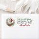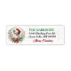 The left side of these pretty Holiday return address labels features an image of an adorable Chihuahua dog wearing a red and white Santa hat. The dog is enclosed within a festive poinsettia, berry, and green leaf wreath. Your custom text is in green and black at the right. A subtle gold confetti background gives a bit of Christmas sparkle, and there's a "Merry Christmas" greeting at the bottom.