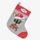 The front of this cute Holiday stocking shows an image of a little black and tan chihuahua wearing a red and white checked scarf and a Santa hat. The image is placed on a silver grey background, and the toe and top border are a red and white snowflake pattern. On the top border is a white label with your custom text in dark grey. The back of the stocking is the same red and white snowflake pattern.