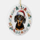 Here's a cute personalized ornament for anyone who loves a Dachshund Dog. The front has an adorable black and tan Dachshund wearing a Santa hat. The image is framed within a colourful circle wreath made up of various Holiday images, including a snowman, bells, candy cane, stocking, holly, and more! The back of the ornament has the same wreath image with your custom text in green and red.