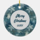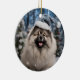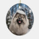On the front of this Holiday ornament is the image of a beautiful Keeshond Dog wearing a blue winter Santa hat. Behind the dog are snow covered trees, and snow falls gently around. The back has a pretty blue ornate snowflake background, with your custom text on a silver circle banner.