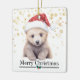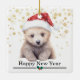 On this cute Holiday ornament, an adorable little white polar bear cub wears a red and white Santa Claus hat. The text at the bottom front says "Merry Christmas". A gold snowflake background pattern adds interest to the design. The same image is on the back, but the text that says "Happy New Year" is a custom text field that you may easily change to a name or a signature, if you'd like.