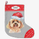 The front of this Holiday stocking shows an image of a Poodle wearing a Santa hat. The image is placed on a silver grey background, and the toe and top border are a red and white snowflake pattern. On the top border is a white label with your custom text in dark grey. The back of the stocking is the same red and white snowflake pattern.