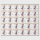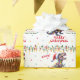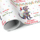 The cute pattern on this Christmas wrapping paper is of a T-Rex dinosaur wearing a red and white Santa Claus hat. He is roaring at a string of Christmas lights above him, while being wrapped in lights he has already torn down. Between the dino images is your custom text in red. Everything is placed on a multi colour round ball confetti background. This is a perfect paper for grandparents, parents, aunts and uncles to wrap family gifts in, especially for kids who love dinosaurs. Be sure to see the gift tags and other matching products in our store.