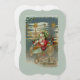 Here comes Santa! He is steering his amazing flying machine through the night sky. Stars, streamers and fancy decorations bedeck the aircraft and its load of wonderful toys for Christmas morning. The restored image of a Victorian postcard features a frosty background, gold accents and beautiful, bright colours. It is framed in icicles and ornaments with a Christmas village in the background.