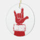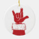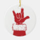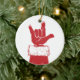 Santa's red gloved hand making the ASL sign for "I Love You".