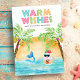 Tropical "Warm Wishes" Christmas card features Santa and a mermaid swimming in the ocean at sunset, framed by a pair of palm trees decked out in string lights. Santa is sipping a cocktail out of a pineapple and flashing the Hawaiian aloha hang loose sign. Art by KL Stock.
