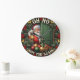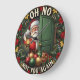 This humorous, rustic clock features a startled Santa Claus peeking around a green door, holding a lantern and looking down at a pile of colorful Christmas ornaments and a small reindeer plush toy. The words "OH NO" and "NOT YOU AGAIN" frame the scene, which is bordered by a festive garland of pine and poinsettias. The design may look real due to the high detail and three-dimensional texture in the artwork.
