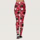 Christmas leggings featuring a pattern of Santa outfit elements, like the hat, boots, and fake beard. The leggings have a red background.