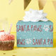 Red SANTA PAWS text with snowflakes on turquoise background.