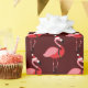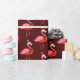 Novelty Christmas wrapping paper with a pattern of pink flamingos in Santa outfits on a burgundy background.