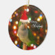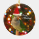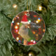 Cute Quaker Parakeet ornament! The green parrot wears a bright red Santa hat in front of a colourful winter background. Fun for the bird lover's Xmas tree this holiday season.