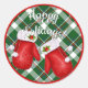 Santa Red Mittens On Red Green Plaid Check Pattern Classic Round Sticker