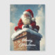 The image shows Santa Claus sitting atop a snow-covered brick chimney, dressed in his iconic red suit with white fur trim and a red hat. He is smiling warmly, his gloved hands clasped together, as snow gently falls around him. The background features a soft, wintry sky with light clouds, enhancing the festive and magical atmosphere of the scene.