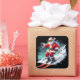 Santa, dressed in his traditional red suit, skilfully skis down a snowy slope, showcasing impressive moves. The festive scene captures the joy of winter sports, with snowflakes cascading around him amidst a backdrop of snow-covered mountains.