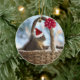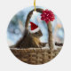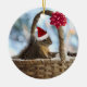 Photo of a squirrel wearing a Santa hat sitting in a basket with snow all around. The basket has a bright red Christmas bow. This cute squirrel picture is a fun way to celebrate the holiday season and can be easily customized with your own text on many different products for Christmas.