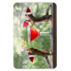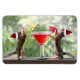 Two Santa squirrels drinking a red cocktail from a large martini glass through umbrella straws. The squirrels are wearing Santa hats and standing on their hind legs with evergreen tree branches surrounding them and in the background. This is an original Christmas squirrel photo to help make your holidays fun!