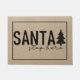 Santa Stop Here with Christmas Tree Doormat. Faux burlap canvas texture background.